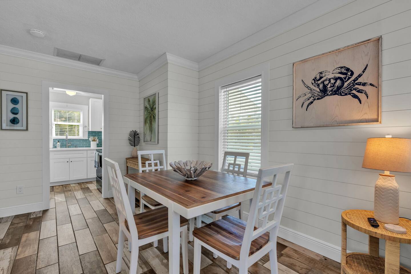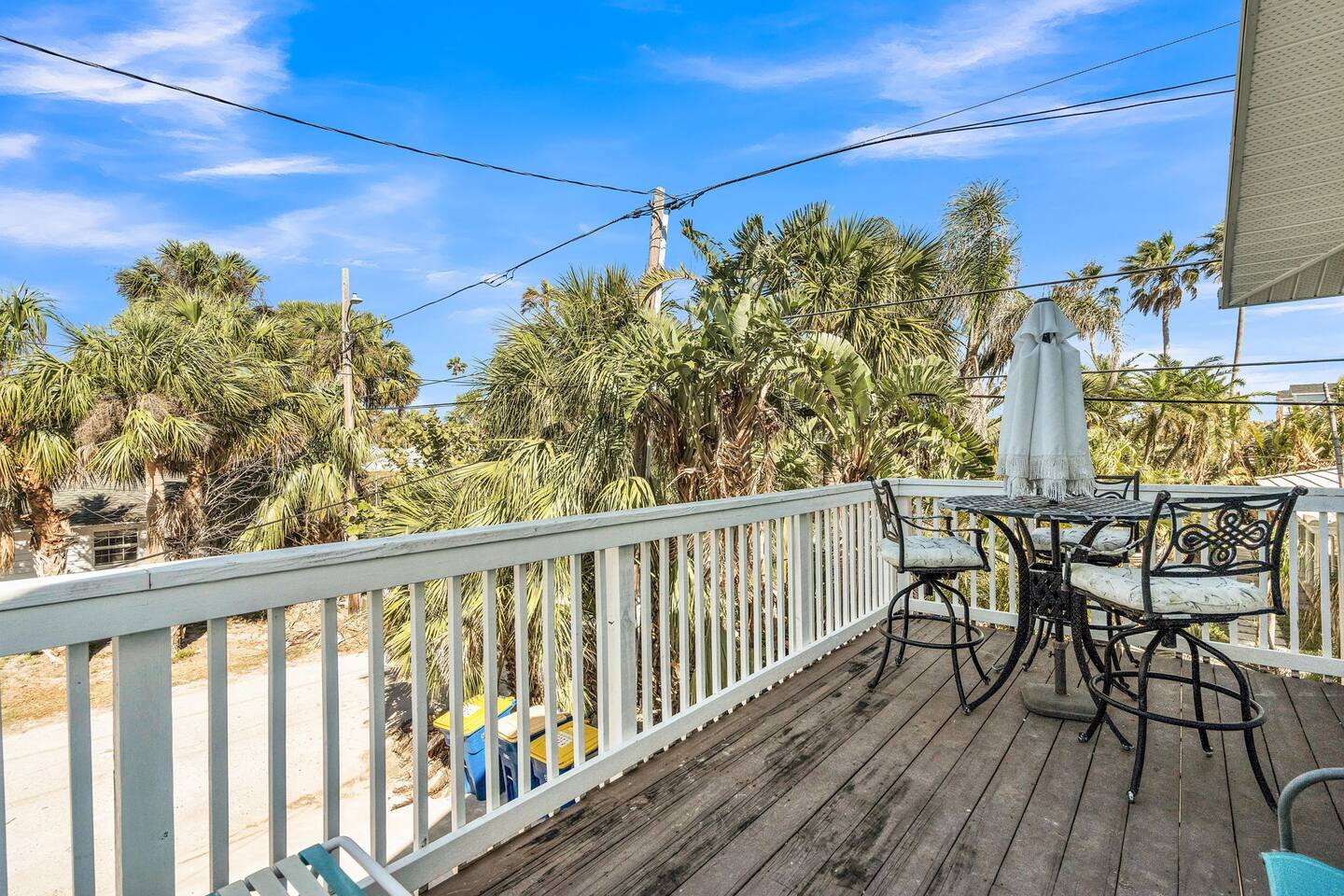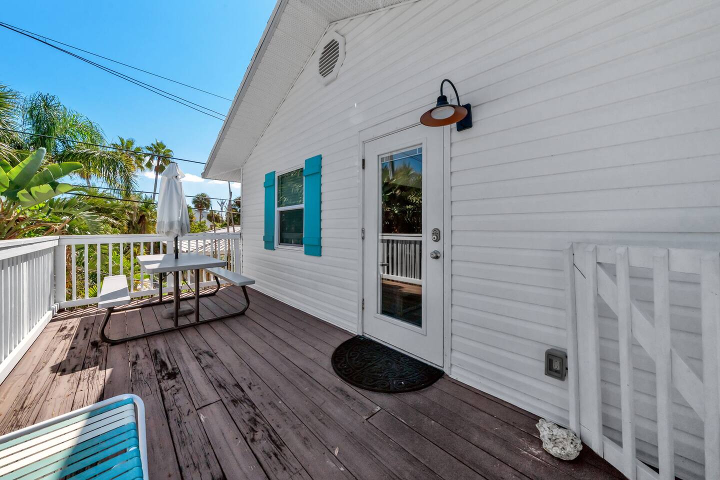 Our Upper unit features an open kitchen and dining area, flooded with natural light by all of the surrounding windows. There is a nice outdoor balcony off of the front, with a high table, chairs, and a lounger. The two spacious bedrooms (each with a Queen bed) also have a tub/shower bathroom in between. The shared Heated Pool is just downstairs with a shared outdoor area with tons of seating. Beach towels and chairs included! Best of all, the beach is just a few houses down. Pickleball close-by!