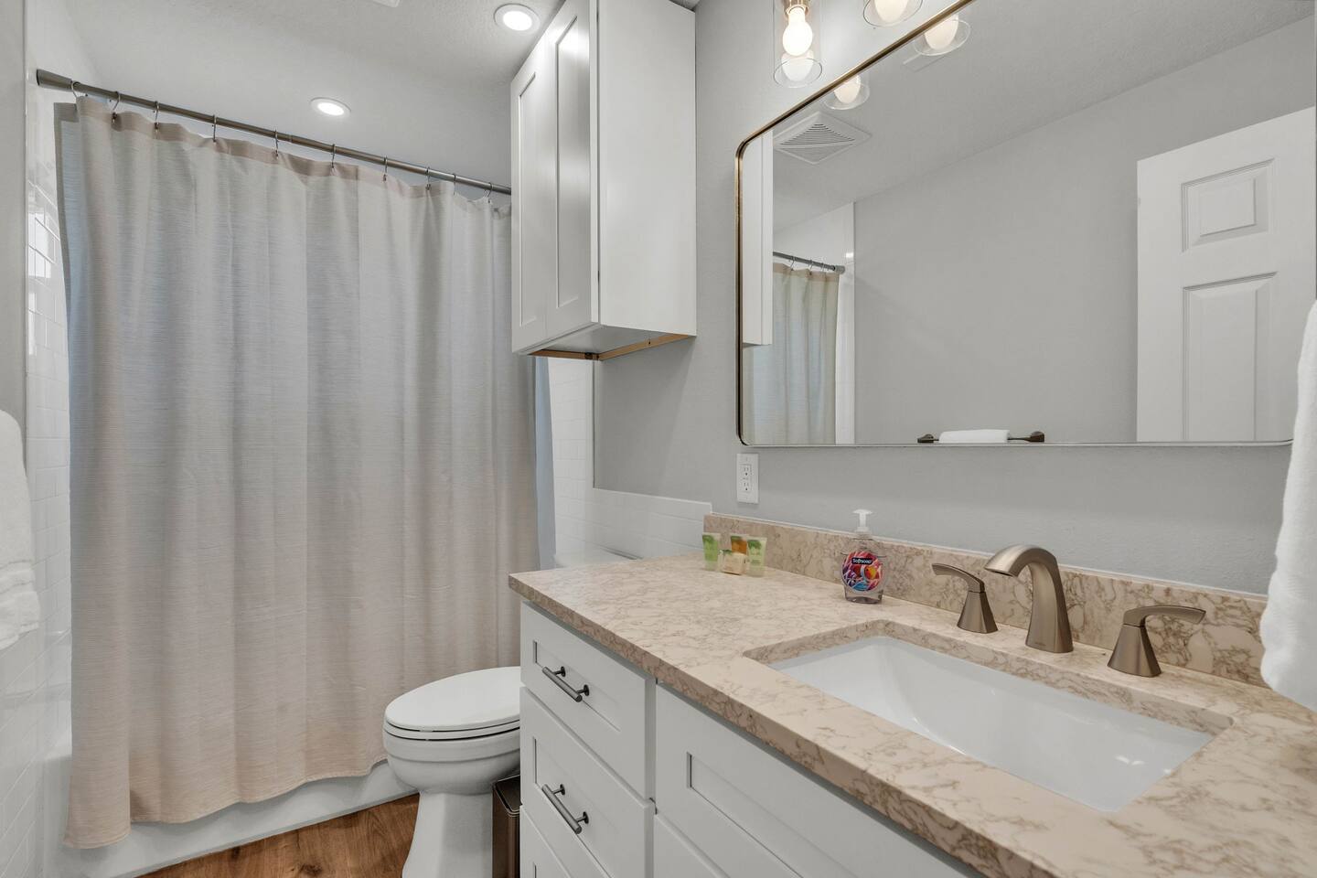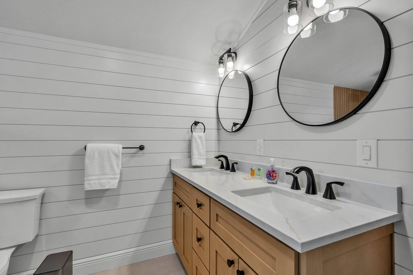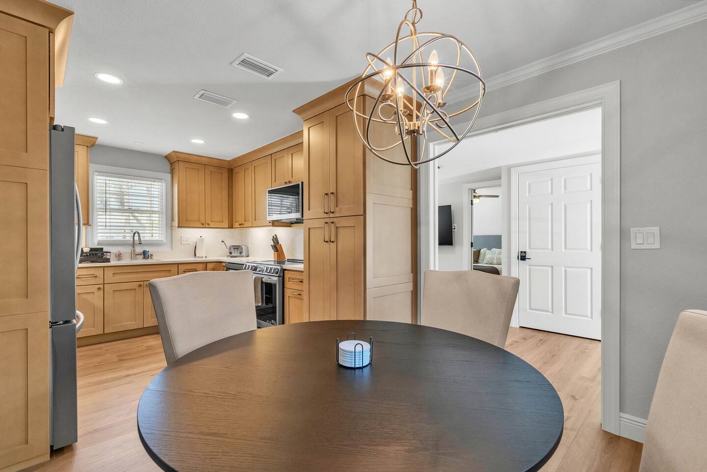 Upon entering the home you are greeted with the first large Family Room. Two french doors lead from the Family Room to a brand new covered Screened-in Porch area for eating meals and lounging. Adjoining the Family Room is a large dining room (seating for 8) and an open kitchen. The bedrooms have great separation and privacy: Bedroom 1- King bed Bedroom 2- Queen bunk bed (with Twin up top) plus a Full bed (with a twin trundle below) Bedroom 1 and 2 share a totally renovated spacious bathroom. On the other side of the house there is a SECOND Family Room which has double doors that can close off the entire wing from the rest of the house. Bedroom 3- King bed with attached en-suite Bath The split plan can allow multiple families or friends to maintain a bit more privacy than would normally be offered. There is access to the fenced backyard from each of the two living wings. Quiet hours strictly enforced from 10pm-7am.