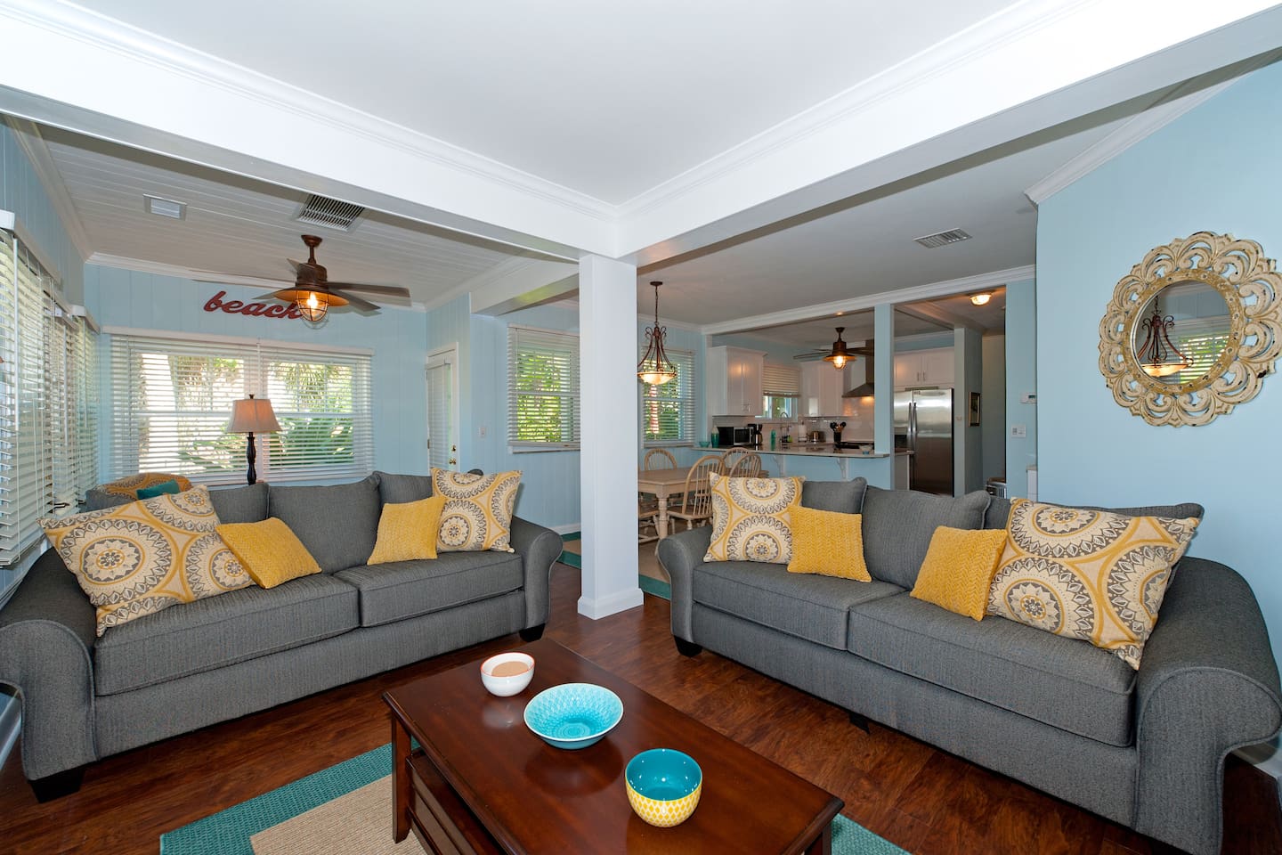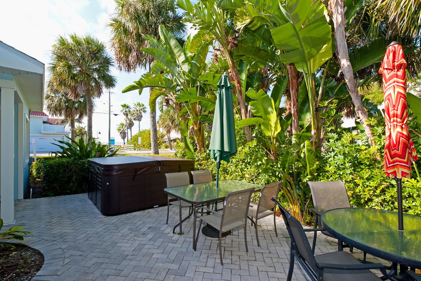House sleeps 6 - Private patio and Hot Tub, Wifi, Grill . '32 Steps to the Beach' is a charming and cozy Clearwater Beach retreat in a TOP LOCATION. The pristine Gulf Beach is just across the street! We also have a Cottage at the same address and they can be rented separately or together. Covid-19 UPDATE - See below. To book the House & Cottage or the Cottage on its own please see the links to their descriptions at the right of this page. THE HOUSE is a tastefully decorated, upscale and well-equipped beach home that has been completely remodeled. It sleeps 6 guests and offers 3 bedrooms, 2 bathrooms, an open kitchen and a cozy living/dining area with a sofa sleeper. You will love the secluded, tropical patio which offers a hot tub and a BBQ for relaxing moments. The property is located in a quiet and upscale, residential neighborhood of Clearwater North Beach, just across the street of the beautiful and pristine Gulf Beach. Clearwater Beach with its vibrant public beach life, various shopping opportunities and diverse restaurants is just a mile away. The House and Cottage can be BOOKED TOGETHER OR SEPARATELY and are the perfect place for families, family get togethers or romantic get-aways. It is NOT SUITABLE FOR SPRINGBREAKERS or any group that wants an environment that allows loud parties. THE AWARD-WINING GULF BEACH IS ONLY 32 STEPS AWAY! Grill, TVs, cable, WIFI, multiple driveways for parking, beautiful landscaping. Walk to shopping, dining or island attractions. Take the public trolley around the island or go as far south as Treasure Island! Check-in is 4:00pm or later; check-out is promptly at 10:00am to leave time for cleaning crew. IMPORTANT: We do not advertise on Craigslist! Be safe and only deal with the owner. COVID-19 Pinellas County is open for short term vacation rentals with guidelines that we are following in full. We take the safety of our guest and cleaning staff extremely seriously. Our cleaning crews are using sanitizer and disinfectant on all surfaces before your arrival and as cleaning is taking longer than previously it is unlikely that we can offer early check-ins or late checkouts. Our houses have well equipped kitchens and we believe that separate units are the best option for vacationing in the time of Covid-19. Florida is seeing an increase in cases at the moment and we stress the importance of guests taking travel insurance that would cover them in the event that they no longer want to travel to Florida. In the event that the administration halts vacation rentals we would of course refund guests as we could no longer accept them. We have to stress that after two months of cancellations and re-bookings we will not be able to offer refunds if Clearwater Beach remains open for vacation rentals but guests decide not to travel.